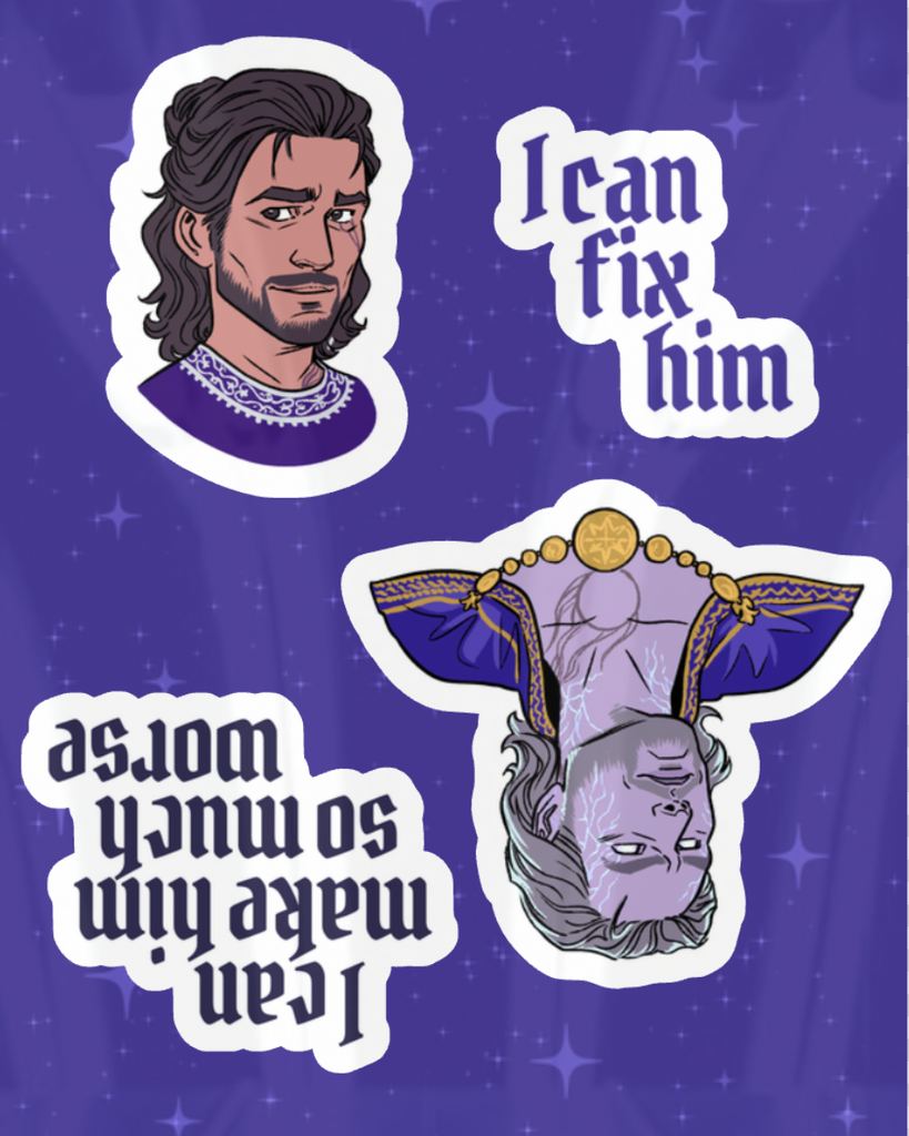Baldur's Gate 3 gave us the ultimate fictional experience...being able to truly "fix him". Or, depending on your choices, make him even worse. 5.1" x 6.4" sheet of high quality vinyl stickers.